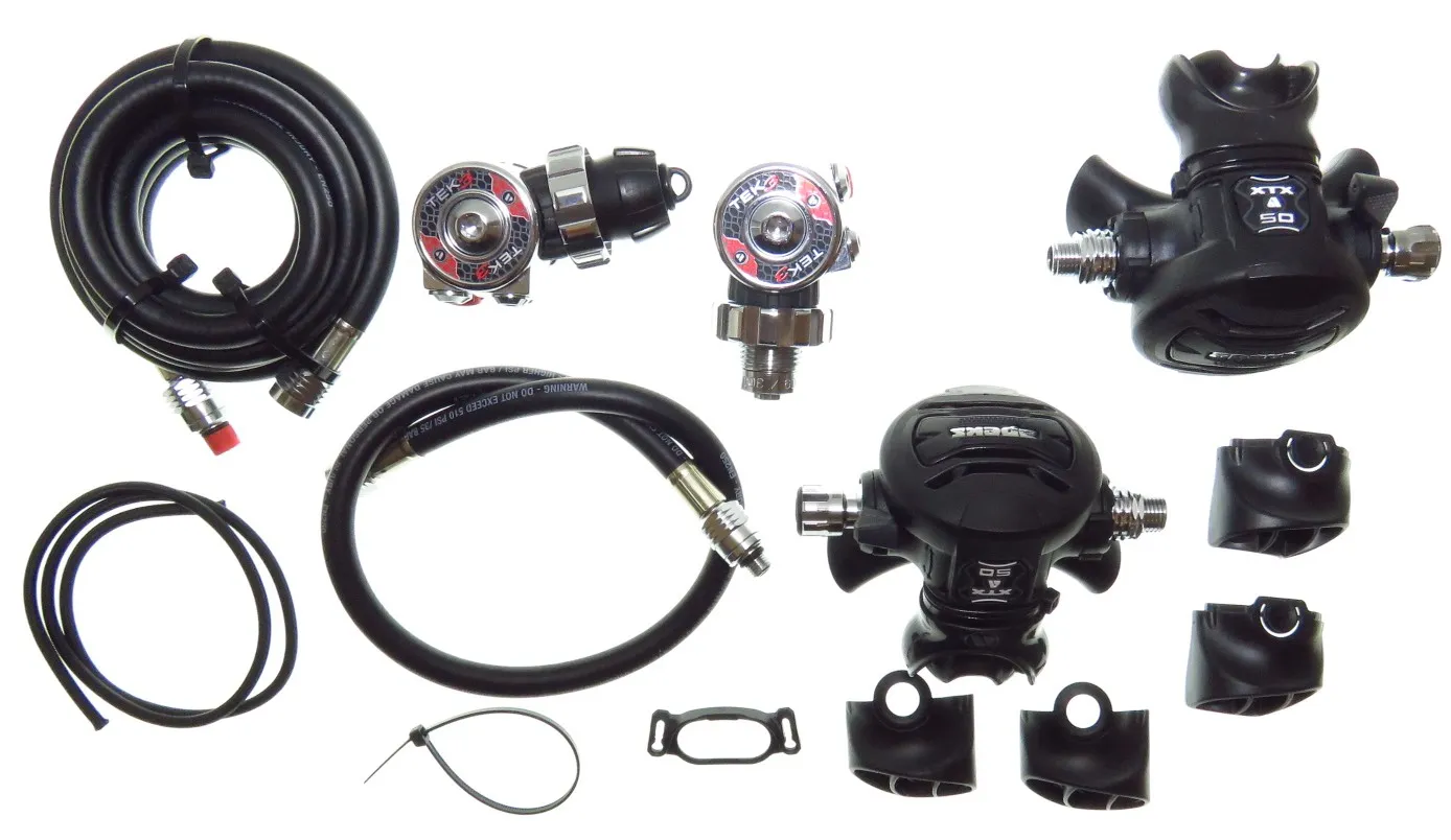 Apeks TEK 3 разработан специально для использования со спаркой. Система Apeks TEK 3 представляет собой две первые ступени, шланги от которых ко вторым ступеням застрахованы от случайного зацепления и делают доступ к вентилю максимально удобным. Каждая из ступеней Apeks TEK 3 имеет 3 порта среднего давления и один порт высоким давлением. Регуляторы сбалансированы, совместимы с холодной водой и очень надежны.Полный комплект для спарки от Apeks. Комплект включает в себя: правый и левый редуктор, 2 легочника XTX50, шланги 1 метр и 2 метра, дополнительные дефлекторы, хомуты и венгерку.
